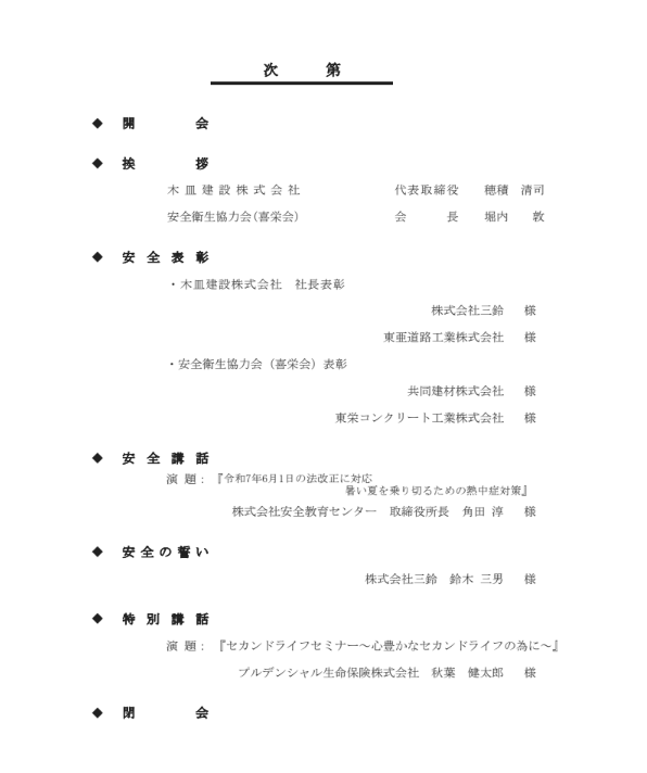 2025年安全衛生協力会(喜栄会)安全大会開催について 2025-06-27 04:26:45 UTC 2025年6月25日に若林体育館にて協力会社の皆様にご参加いただき、 安全衛生協力会(喜栄会)安全大会を開催いたしました。